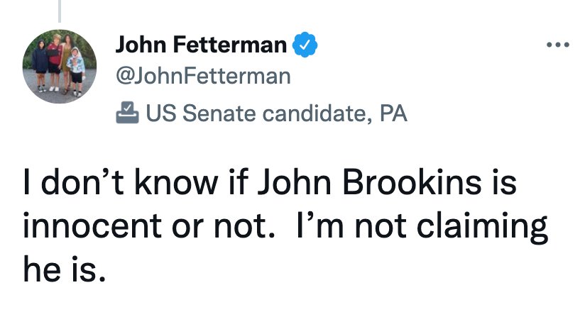 This is what John Fetterman tweeted just before voting to release John Brookins — a man convicted of first-degree murder for killing a woman with a pair of scissors.