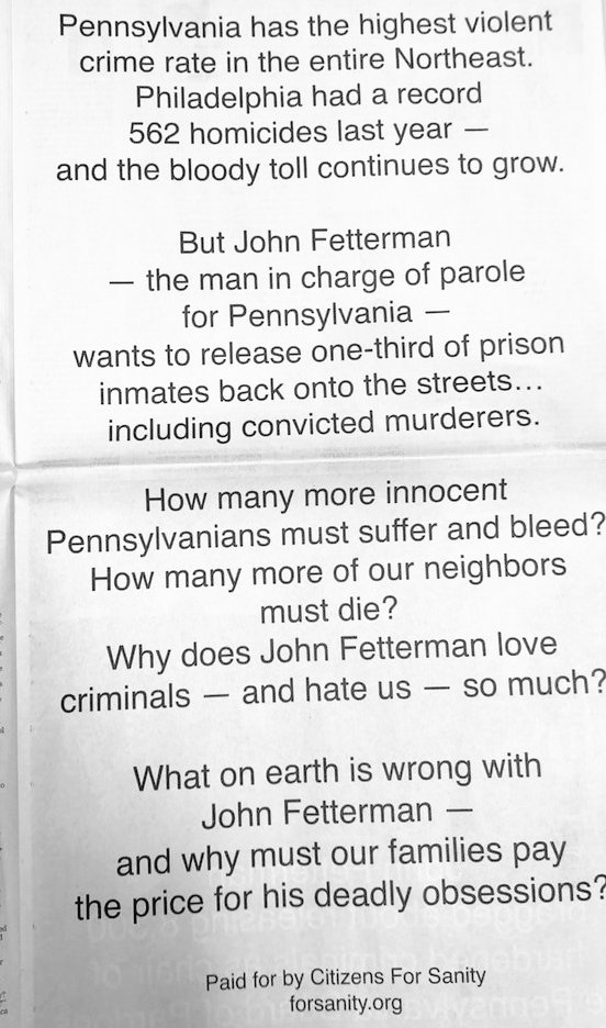 Racist Fetterman's support for the Krasner “Conviction Integrity Unit” is another example of Fetterman trying to free as many criminals as possible.