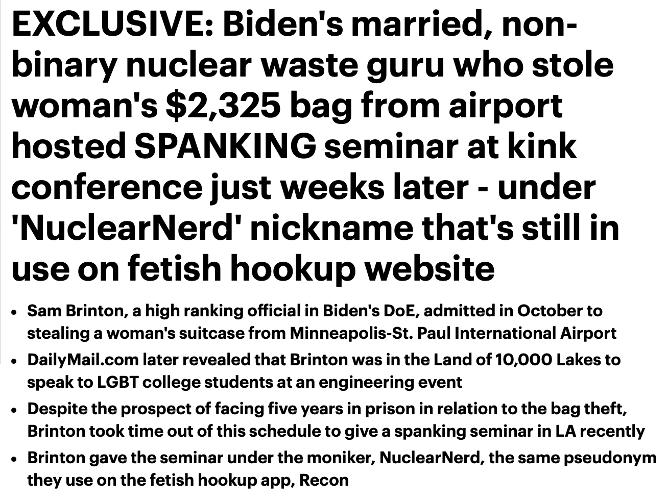 Sam Brinton was charged last month with swiping a suitcase of women’s clothes from the Minneapolis-Saint Paul Airport in September, less than five months after assuming the post of deputy assistant secretary of the Office of Spent Fuel and Waste Disposition at the Department of Energy. The stolen Vera Bradley suitcase along with its contents were worth $2,325, according to a criminal complaint.